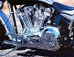The sheetmetal for the bike was the next aspect that GP Designs would tackle. It started with a Russ Wernimont rear fender, a GP Designs oil bag, a Robert Moore front fender, and an H-D gas tank. The fenders were fit exactly to the tires mounted with a set of special construction billet fender struts made by the GP crew. Then, the gas tank was stretched before all the bike's skin was mocked up on the frame to test for fitment. The sheetmetal needed paint, and it was all shipped to Riff Raff Customs, where it received generous coats of two-tone silver and black, with a cool jagged edge separating the two colors.